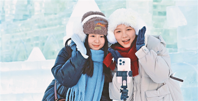 身著單薄的公主裙,正在冰景前拍攝寫(xiě)真的一名女孩,成為園區(qū)內(nèi)一道別樣風(fēng)景?!半m然很冷,但能化身‘冰雪公主’,在享譽(yù)世界的冰雪大世界里拍上一組照片,值了?!庇慰蛷埫扰d奮地說(shuō)。