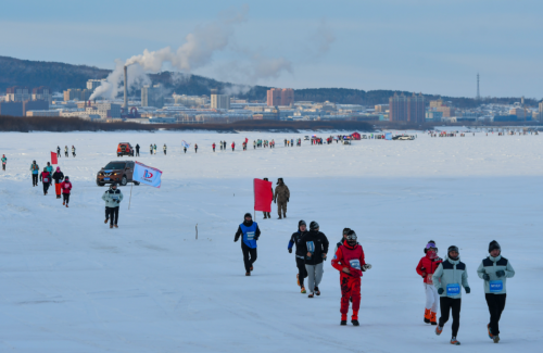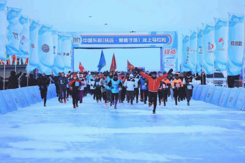 中國(guó)東極(撫遠(yuǎn)·黑瞎子島)冰上馬拉松賽已經(jīng)連續(xù)五屆在撫遠(yuǎn)市舉辦,憑借地域唯一性和極限挑戰(zhàn)性,成為全球五大冰上馬拉松之一,開(kāi)創(chuàng)中國(guó)極限冰雪馬拉松運(yùn)動(dòng)的先河。本屆賽事由黑龍江省體育局、佳木斯市人民政府主辦,省政府黑瞎子島建設(shè)和管理委員會(huì)、撫遠(yuǎn)市人民政府承辦。中國(guó)奧委會(huì)副主席、中田協(xié)名譽(yù)主席段世杰前往比賽開(kāi)幕式鳴槍。賽事設(shè)有全程馬拉松、半程馬拉松、新年歡樂(lè)跑三個(gè)項(xiàng)目。清晨7點(diǎn),撫遠(yuǎn)市的氣溫達(dá)到了零下23.3攝氏度,選手們紛紛帶上防風(fēng)面罩、保暖帽、手套、太陽(yáng)鏡、防滑冰爪等應(yīng)對(duì)極端嚴(yán)寒環(huán)境下的特殊裝備,在全程42.195公里的冰賽道上,徒步穿越冰雪世界,體驗(yàn)當(dāng)?shù)鬲?dú)特冰雪文化和民俗風(fēng)情,品嘗賽道補(bǔ)給站提供的熱氣騰騰的鱘鰉魚鍋、鮮鯽魚湯等地方特色補(bǔ)給品,補(bǔ)充能量抵御嚴(yán)寒。