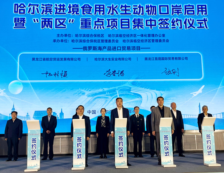 同日,哈爾濱進(jìn)境食用水生動物口岸啟用暨“兩區(qū)”重點(diǎn)項目集中簽約儀式在哈爾濱臨空經(jīng)濟(jì)區(qū)舉行。“兩區(qū)”一體化辦公室主任介紹了哈爾濱進(jìn)境食用水生動物指定監(jiān)管場地和保稅航油項目基本情況。