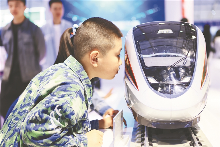 第三十三屆哈洽會(huì)成為了孩子們長(zhǎng)見(jiàn)識(shí)的窗口。在中國(guó)中車的展臺(tái)前,孩子們的目光被一組組精美的列車模型所吸引?!拔覐膩?lái)沒(méi)有見(jiàn)過(guò)這么多不同種類的列車模型”“我最喜歡的是和諧號(hào),它看起來(lái)科技感十足?!蹦芡瑫r(shí)看到動(dòng)車、和諧號(hào)還有地鐵并排擺在一起,孩子們興奮不已。