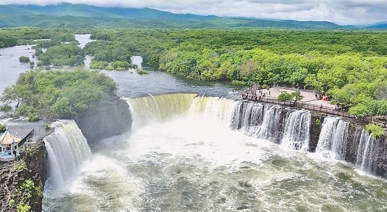 記者從景區(qū)管委會(huì)獲悉,由于連日降水,鏡泊湖吊水樓瀑布在今年首次出現(xiàn)三面飛瀑景觀,站在觀景長(zhǎng)廊能看到三面環(huán)水的壯觀景象。近看瀑布水流一路狂奔,氣勢(shì)恢宏,無(wú)比震撼。