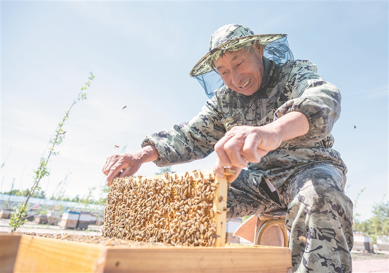 盛夏,草木蔥蘢、百花盛開,正是蜜蜂采蜜的好時節(jié)。走進齊齊哈爾市克東縣東興林場,上百箱規(guī)格統(tǒng)一的木質蜂箱整齊排列,蜂箱周圍,勤勞的蜜蜂們正忙碌地搬運著甜蜜果實,發(fā)出嗡嗡的聲響。