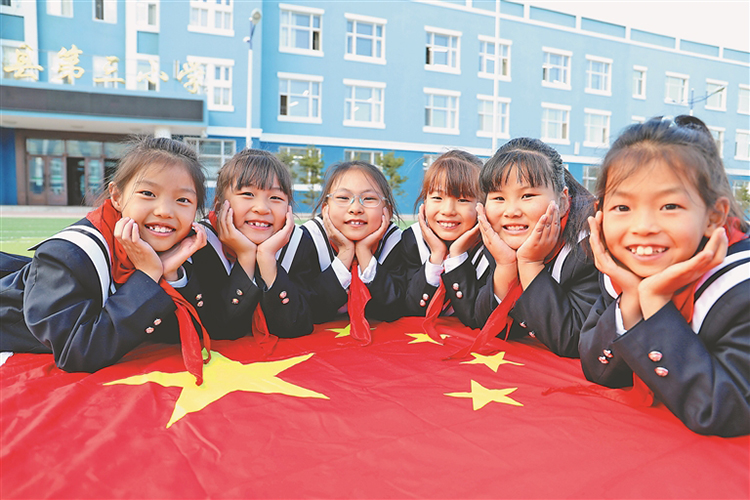 呼瑪縣第二、第三小學(xué)的孩子們和國(guó)旗合影。本報(bào)記者 郭俊峰攝