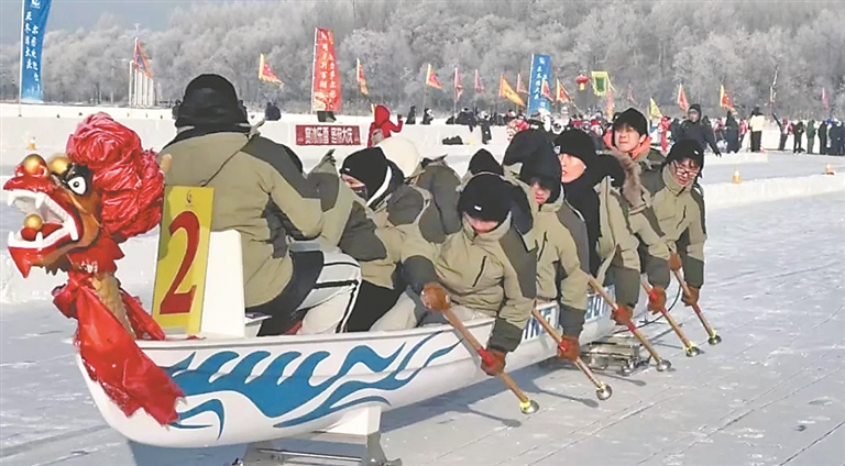伴隨著動(dòng)感的音樂(lè)聲和歡呼聲,冰面之上百釬齊發(fā),龍舟疾馳。隊(duì)員們劃槳?jiǎng)幼髡R劃一,鑼鼓聲、吶喊聲形成了一曲激昂的冬日交響樂(lè)。當(dāng)冠軍隊(duì)伍沖線的一刻,現(xiàn)場(chǎng)爆發(fā)出更熱烈的歡呼聲,豪邁的氣勢(shì)與聲浪響徹萬(wàn)寶湖上空。