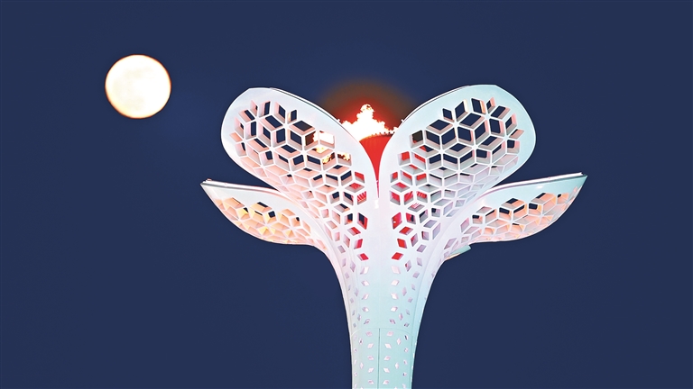 亞冬會(huì)火炬與正月十五的月亮交相輝映。王世琛攝