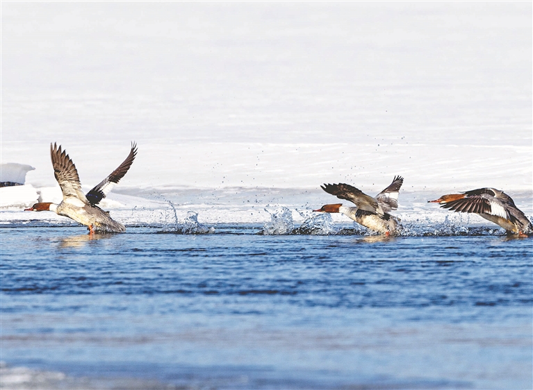 本報訊(黃曉光 記者郭俊峰)近日,國家一級保護動物秋沙鴨翩然而至,為小興安嶺的初春增添了別樣生機。它們在澄澈的水面上悠然游弋,時而將頭扎進水里,探尋著水下的美味;時而歡快地拍打著翅膀,濺起晶瑩的水花。