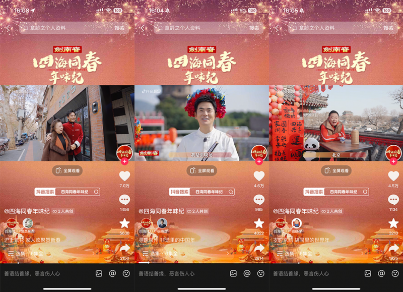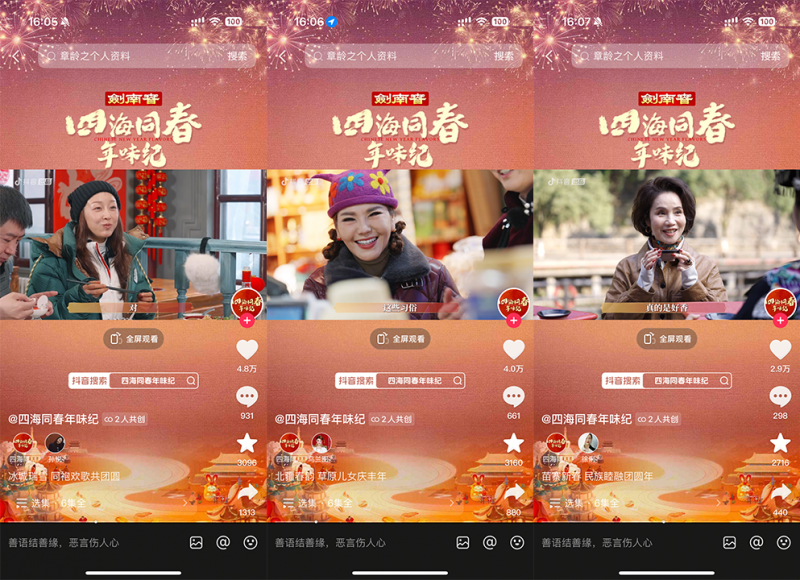 為紀念首個“非遺版春節(jié)”,由抖音出品、中國名酒劍南春冠名的春節(jié)主題紀錄片《四海同春年味紀》邀請多位明星來到家鄉(xiāng)或向往的城市,體驗當?shù)靥厣晡?。紀錄片于1月22日-1月27日,通過抖音、抖音精選、今日頭條、西瓜視頻、鮮時光等平臺播出。截至收官,該片正片播放量超1億,抖音話題播放量破2.3億,全網(wǎng)曝光達10億,相關話題多次登上平臺熱榜。