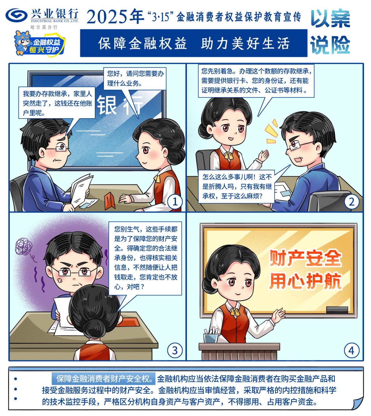“保障金融權(quán)益 助力美好生活”,興業(yè)銀行哈爾濱分行2025年“3·15”金融消費者權(quán)益保護宣傳活動進行中,本期向您介紹金融消費者八項權(quán)益中的財產(chǎn)安全權(quán)。