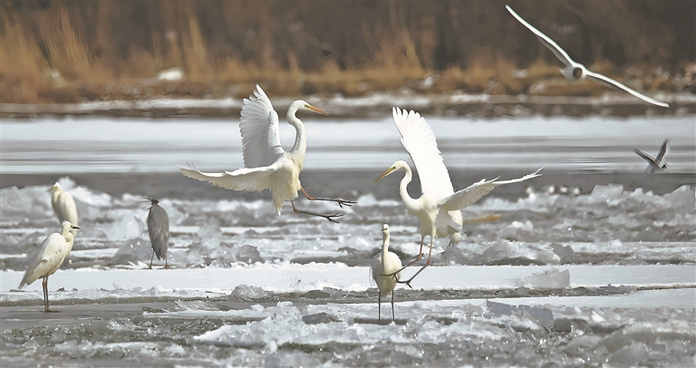 冰排流動,數百只鷺鳥羽翅翻飛,鳴聲陣陣,此時的松花江一派生機勃勃的景象。