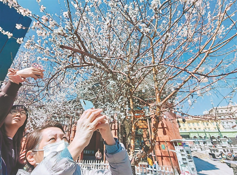 近日,哈爾濱市天空晴朗,空氣優(yōu)良,人們紛紛外出活動(dòng),盡享美好的春光。在松花江畔、中央大街、建筑藝術(shù)廣場(chǎng),市民游客有的在觀賞美麗江景,有的在逛街購(gòu)物,有的在拍攝盛開(kāi)的桃花。