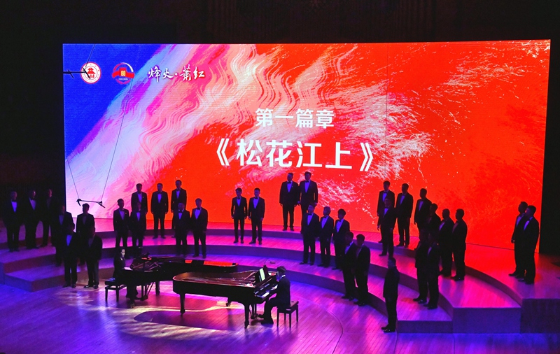 第一篇章《松花江上》以《長城謠》的泣血鄉(xiāng)愁與《義勇軍進(jìn)行曲》的全場肅立高唱,訴盡抗戰(zhàn)時(shí)期的流亡之痛與民族豪情,更創(chuàng)新植入“童年、少女、青年”三代“蕭紅”扮演者(張舒涵、鄭楚琪、尤泓斐)與合唱團(tuán)的情景互動(dòng)。第二篇章《抗戰(zhàn)的烽火》中,《五月的鮮花》《露營之歌》《保衛(wèi)黃河》等作品以合唱與立體站位,緬懷趙一曼、楊靖宇等英烈,再現(xiàn)全民抗戰(zhàn)的壯闊圖景。第三篇章《文脈永續(xù)》則通過魯迅、茅盾等文學(xué)名家對蕭紅的評價(jià)、跨年代讀者代表致敬及《致祖國》的磅礴合唱,彰顯其文學(xué)精神在新時(shí)代的傳承。