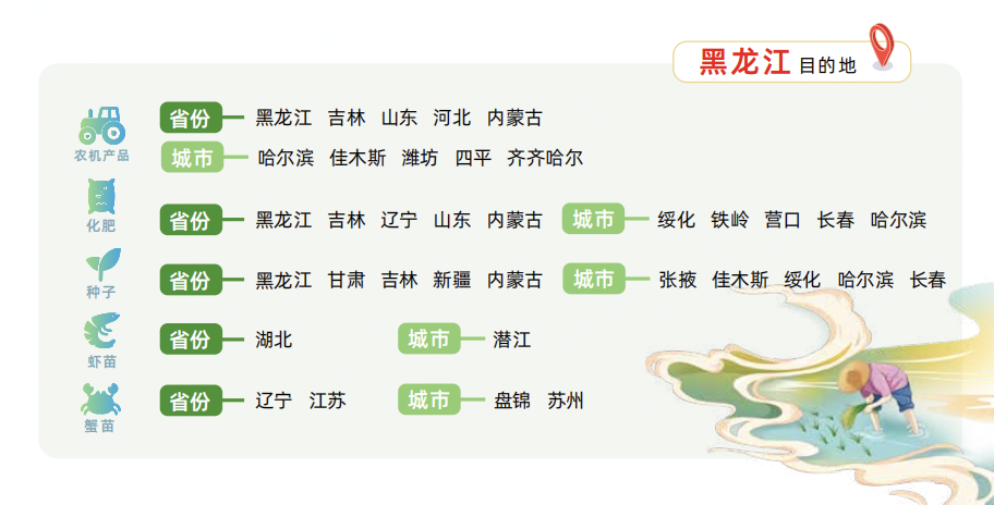 此外,特色水產(chǎn)養(yǎng)殖方面,運滿滿大數(shù)據(jù)顯示,湖北潛江的蝦苗大量運往齊齊哈爾、大慶、牡丹江等地,遼寧盤錦和江蘇蘇州的蟹苗則主要供應(yīng)大慶、綏化、黑河、齊齊哈爾和雙鴨山,為黑龍江農(nóng)業(yè)多元化發(fā)展注入新動力。