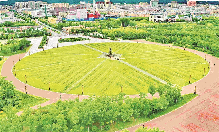距離體育場不遠,有一處數(shù)千平方米的休閑廣場。廣場周邊新鋪了多條紅色慢行步道,是市民們散步休閑的好去處。在中心區(qū)域,工人們正建設(shè)雕塑,為中外游客打造一處美麗的打卡點。