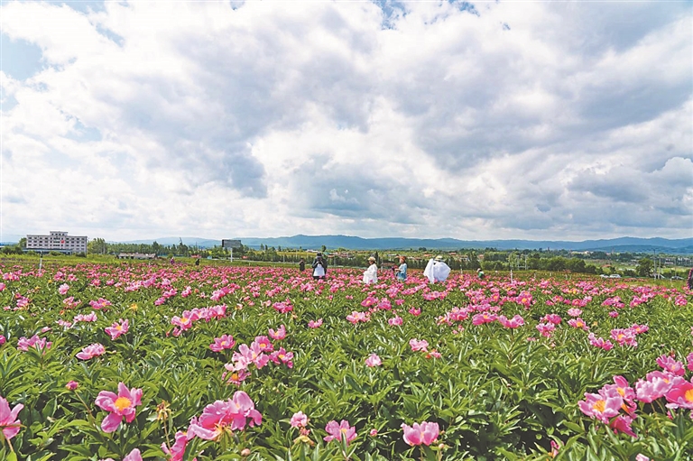 紫云嶺花海將自然美景與人文內(nèi)涵深度融合,游客賞花之余,還可通過景區(qū)設(shè)置的展板了解芍藥歷史,感受“以花傳情”的東方浪漫。圖為絢爛綻放的芍藥花。