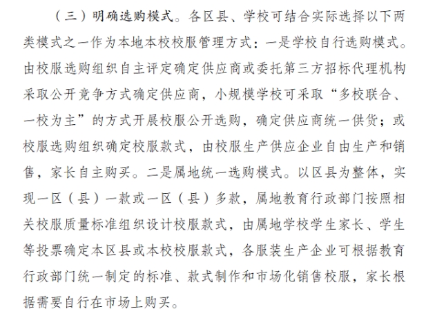 新規(guī)設(shè)計(jì)的“自行選購模式”靈活且務(wù)實(shí):規(guī)模較大的學(xué)??勺灾髟u定供應(yīng)商或委托第三方招標(biāo);小規(guī)模學(xué)??刹扇 岸嘈B?lián)合、一校為主”的方式降低采購成本;甚至允許“確定款式后,由企業(yè)市場化生產(chǎn)銷售,家長自主購買”。新規(guī)嚴(yán)禁“定點(diǎn)”“定商標(biāo)”干涉交易,不得設(shè)置不合理入圍條件,確保所有合規(guī)企業(yè)都能公平參與競爭。