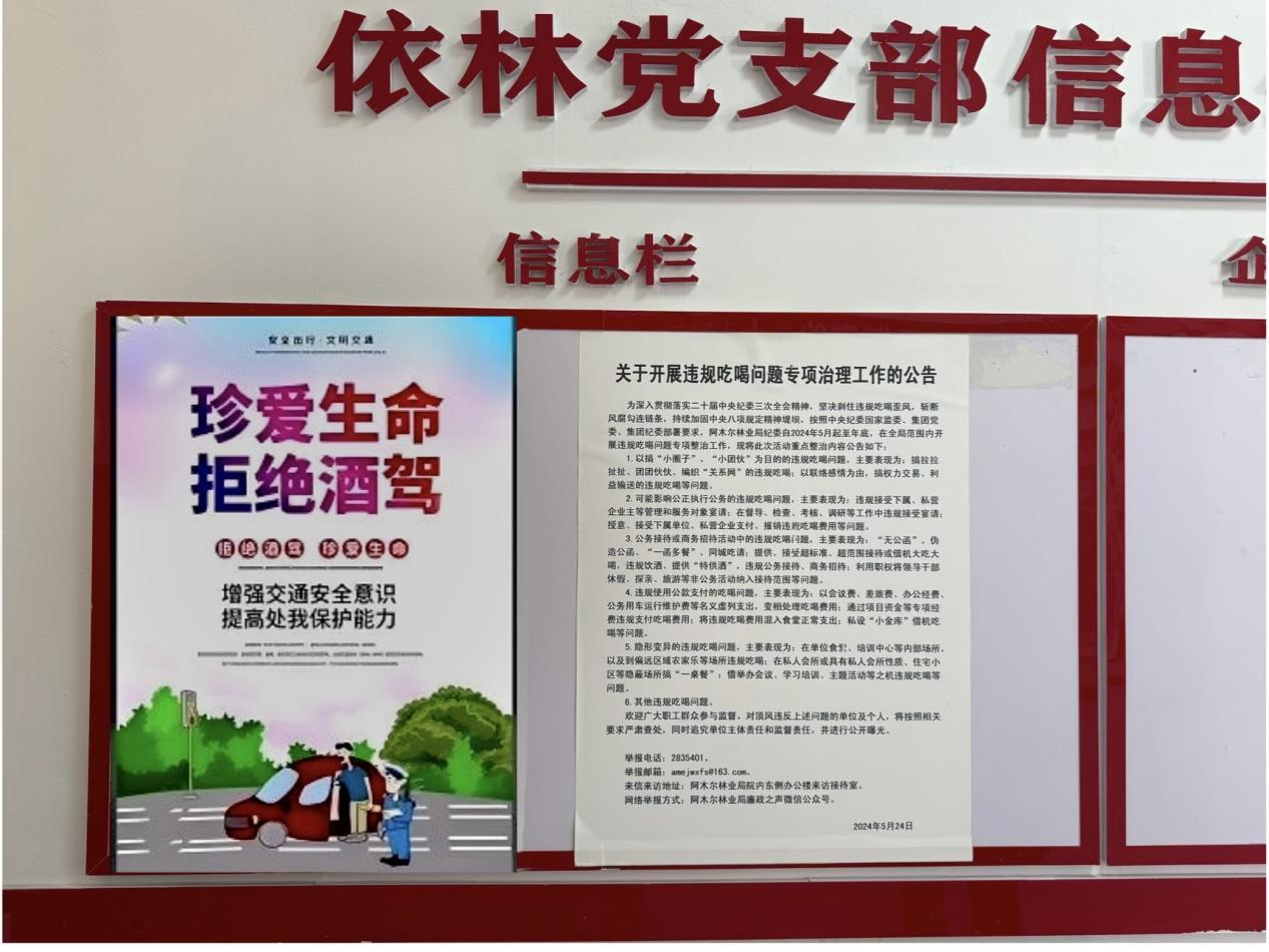 黑龍江經濟網訊(彭云霞)為進一步嚴明紀律、加強作風建設,阿木爾林業(yè)局依林林場黨支部緊盯酒駕醉駕問題,堅持“教育筑基、責任織網、監(jiān)督保障、機制長效”,推動形成全員抵制酒駕醉駕的良好氛圍,實現(xiàn)違規(guī)飲酒和酒駕醉駕“零發(fā)生”。