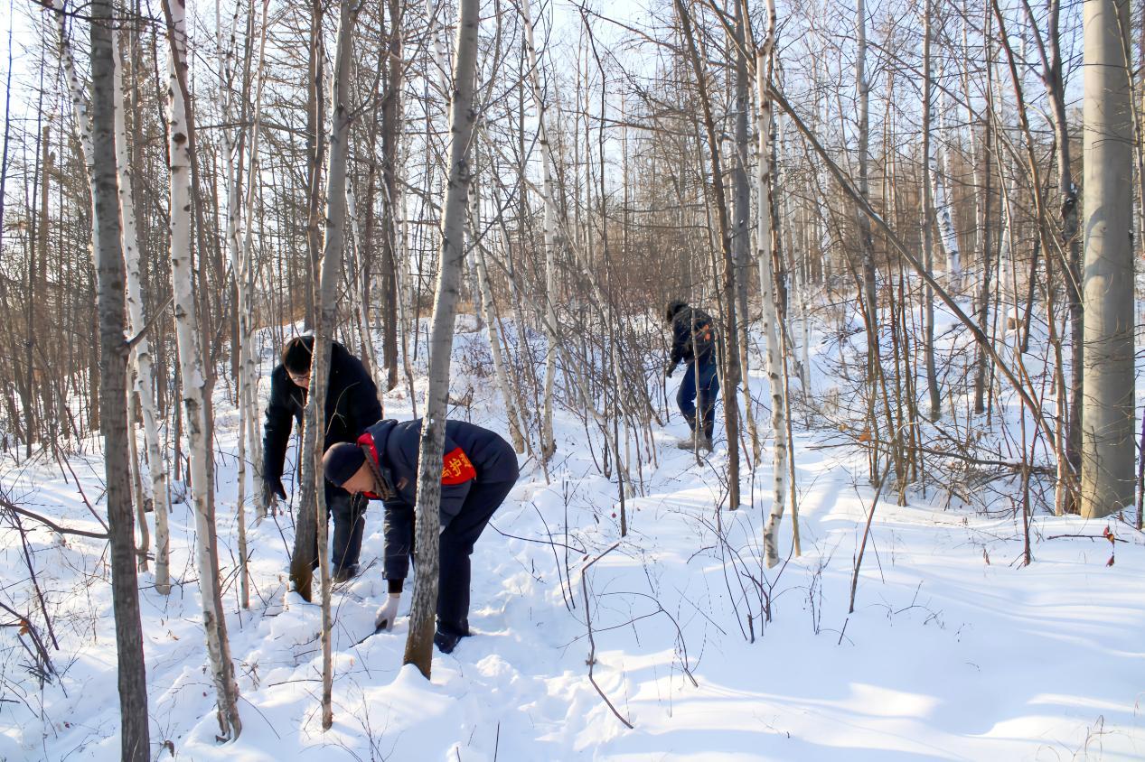 林場工作人員正在仔細(xì)排查可能隱藏在草叢、樹下、石縫中的獵夾、獵套(趙可心 攝)