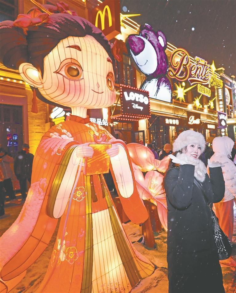 當(dāng)日,鵝毛大雪悄然灑落,覆蓋中央大街、松花江畔、中華巴洛克歷史文化街區(qū)等景區(qū)的各式花燈。紅燈籠覆上薄雪,愈顯艷麗;冰雕彩燈與雪相映,光影夢(mèng)幻,將雪的清冽與燈的暖輝完美融合,整座城市宛如一幅雪景燈畫。